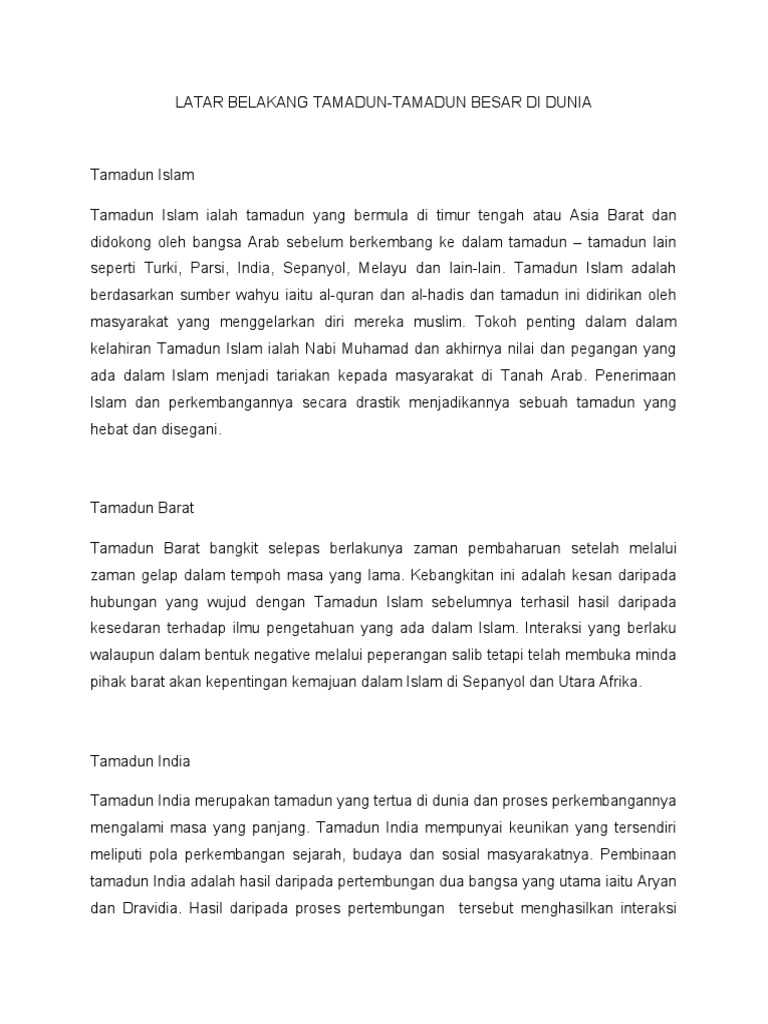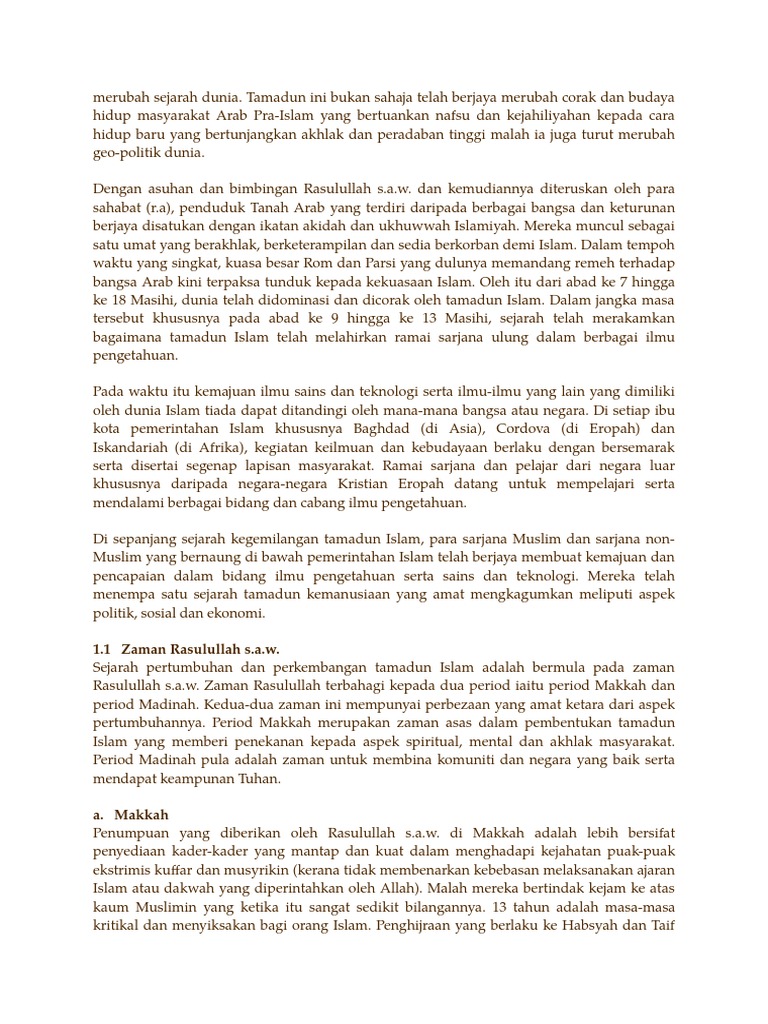 Close suggestions Search Search. Nabi Muhammad SAW sebagai Pemimpin Agama Islam Penerimaan wahyu pertama 17 Ramadhan 6 Ogos 610M di Gua Hira merupakan detik pertama permulaan tamadun Islam a Wahyu pertama dari surah al-Alaq ayat 1-5 b bermula dengan perkataan iqra bacalah c Membaca dan menulis merupakan asas ilmu pengetahuan untuk melahirkan tamadun d. Melalui satu era kecemerlangan antara tahun 2500 1800 SM dan selepas tempoh ini tamadun Indus mengalami keruntuhan yang dikaitkan dengan kedatangan orang Aryan yang.